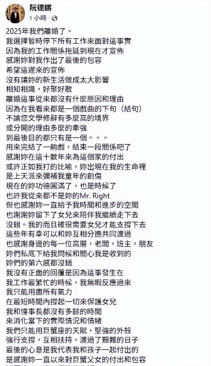 阮德锵在社交平台撰文表示,2人于2025年已正式离婚。他坦言:“我选择暂时停下所有工作来面对这事实,因为我的工作关系拖延到现在才宣布。感谢妳对我作岀了最后的包容,希望这迟来的宣布,没有让妳的新生活做成太大影响。