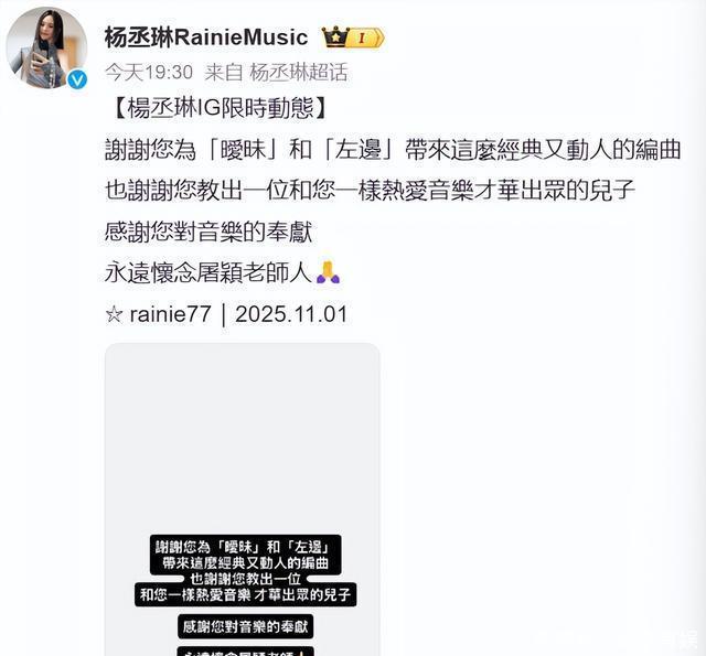 杨丞琳也悲痛悼念,《暧昧》和《左边》的编曲,都出自屠颖之手,这两首歌真的好好听。